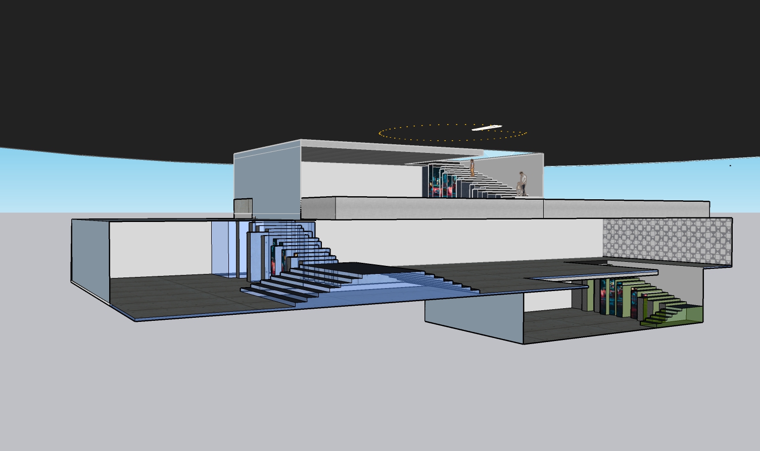 THE DEVELOPED STAIR (20%) and THE ARCHITECTURE (50%): The surface architecture is presented as a single dome structure, with the working space of the client Mountain and Moon located on the mezzanine. The dome itself reflects all three words, with the staircases for each client focused to a specific single word: for Mountain and Moon, 'Ensorcell', and for The Kyza, 'futuristic'. The architecture of the stairs is sympathetic and complimentary to the void (or for the below ground client, The Kyza, the lack thereof) around them, making the staircases in both instances the focus of the space - a simple way to keep the attention of prospective buyers on the products being presented.